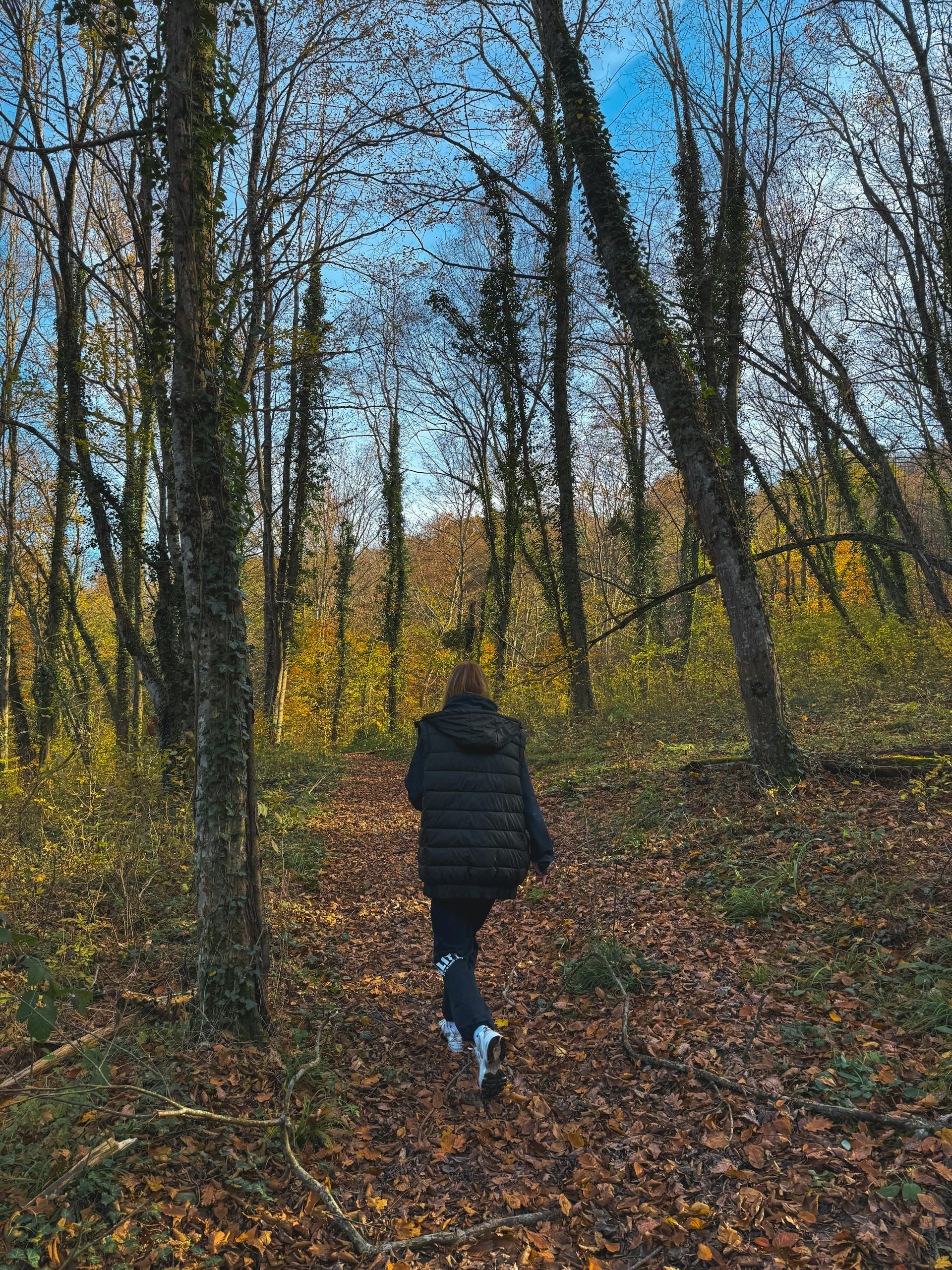 A woman in a black jacket walks through a colorful autumn forest trail.
