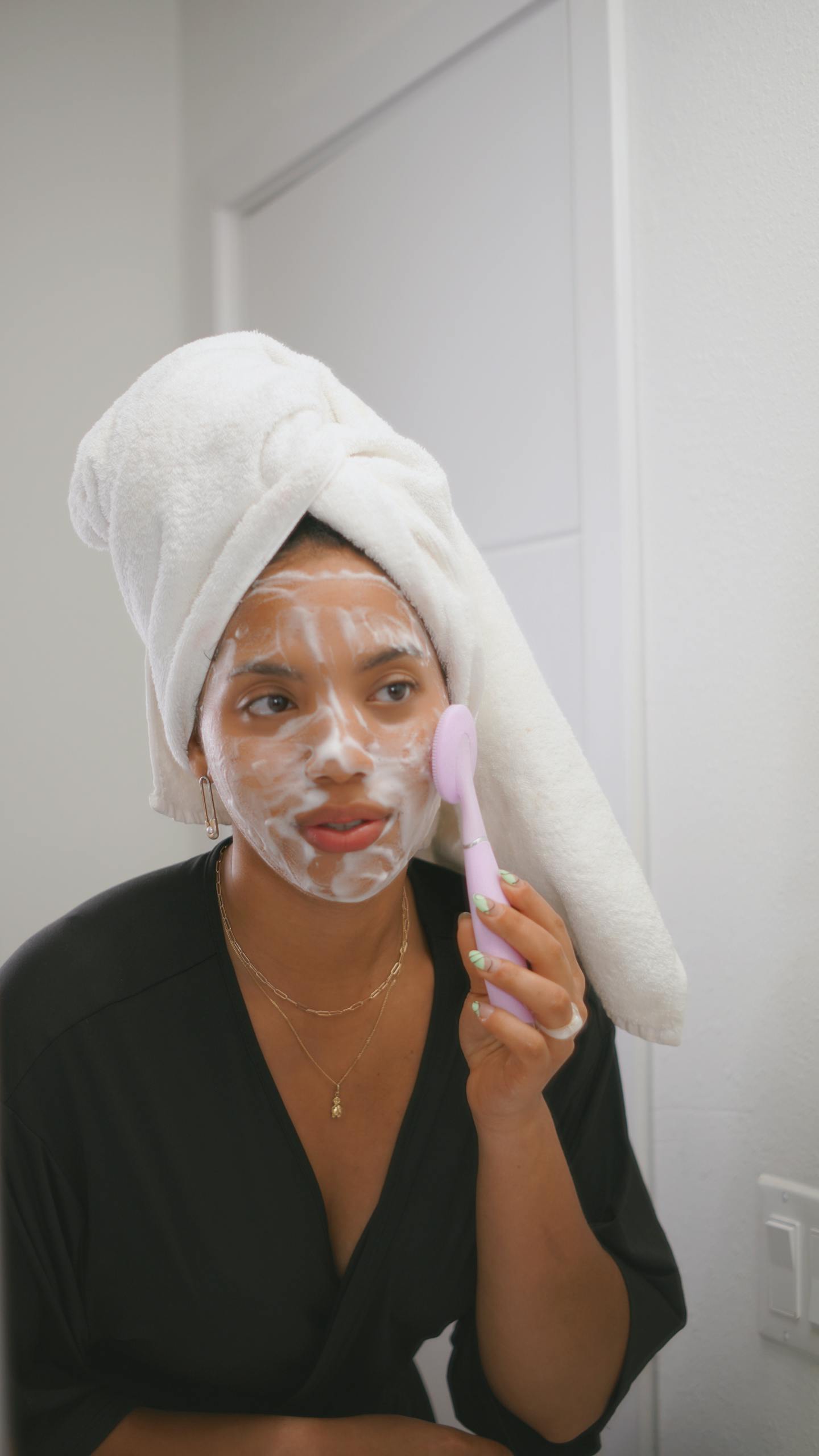 Woman in bathrobe using a facial cleansing brush, wearing a towel turban and face mask.