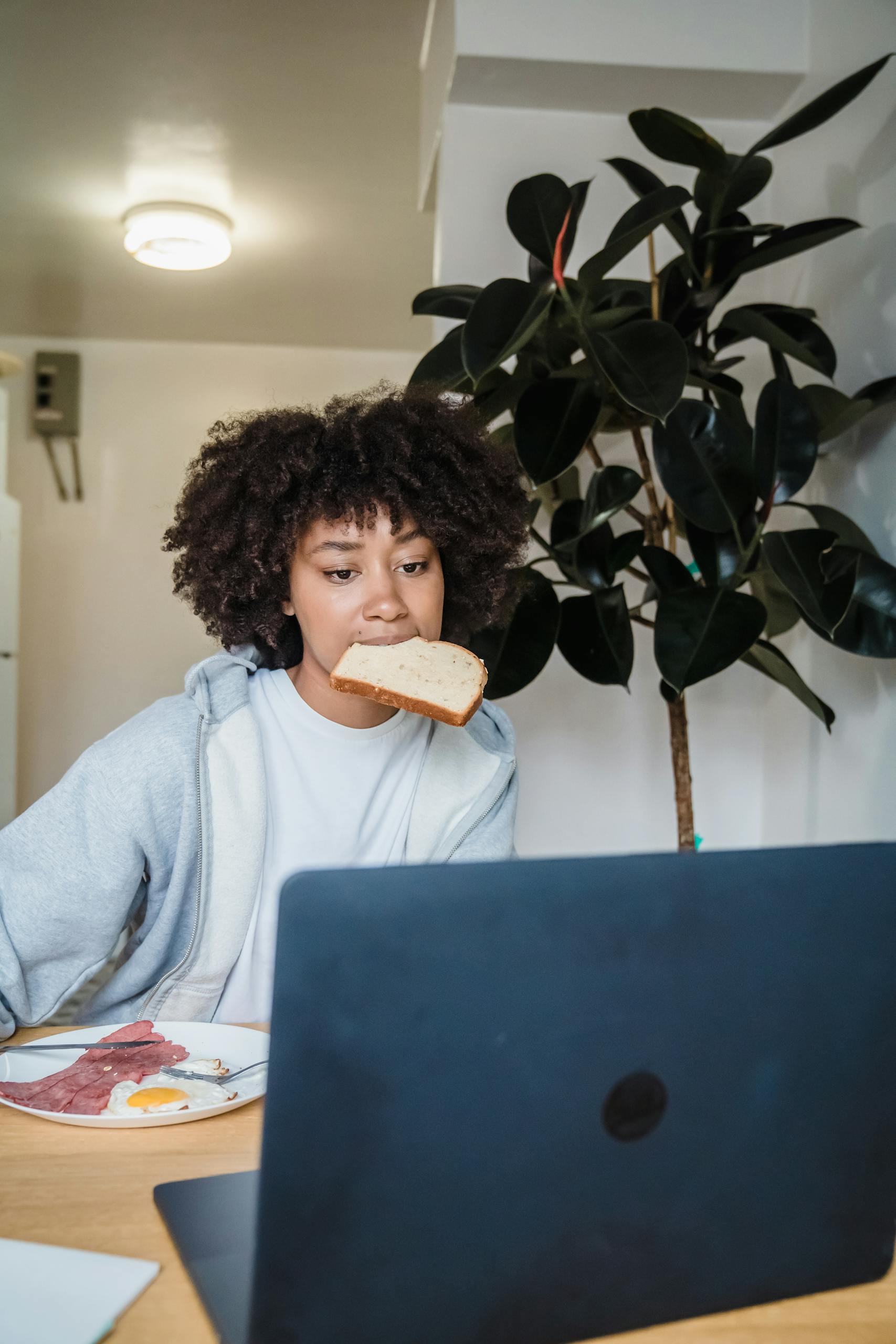Young African American woman eats breakfast while working on a laptop, showcasing multitasking at home.