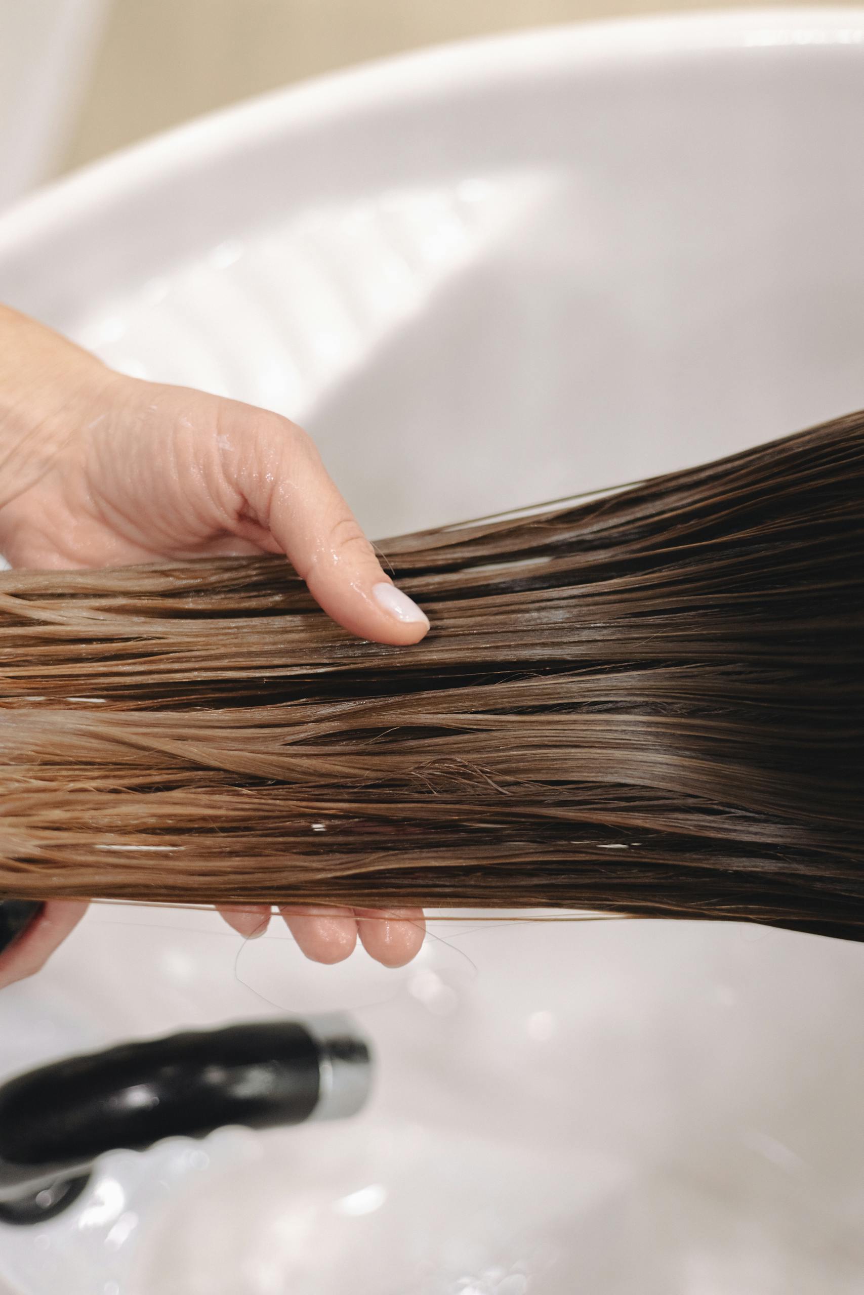 Close-up of hand holding long, wet brown hair over a white ceramic sink, emphasizing hair care.